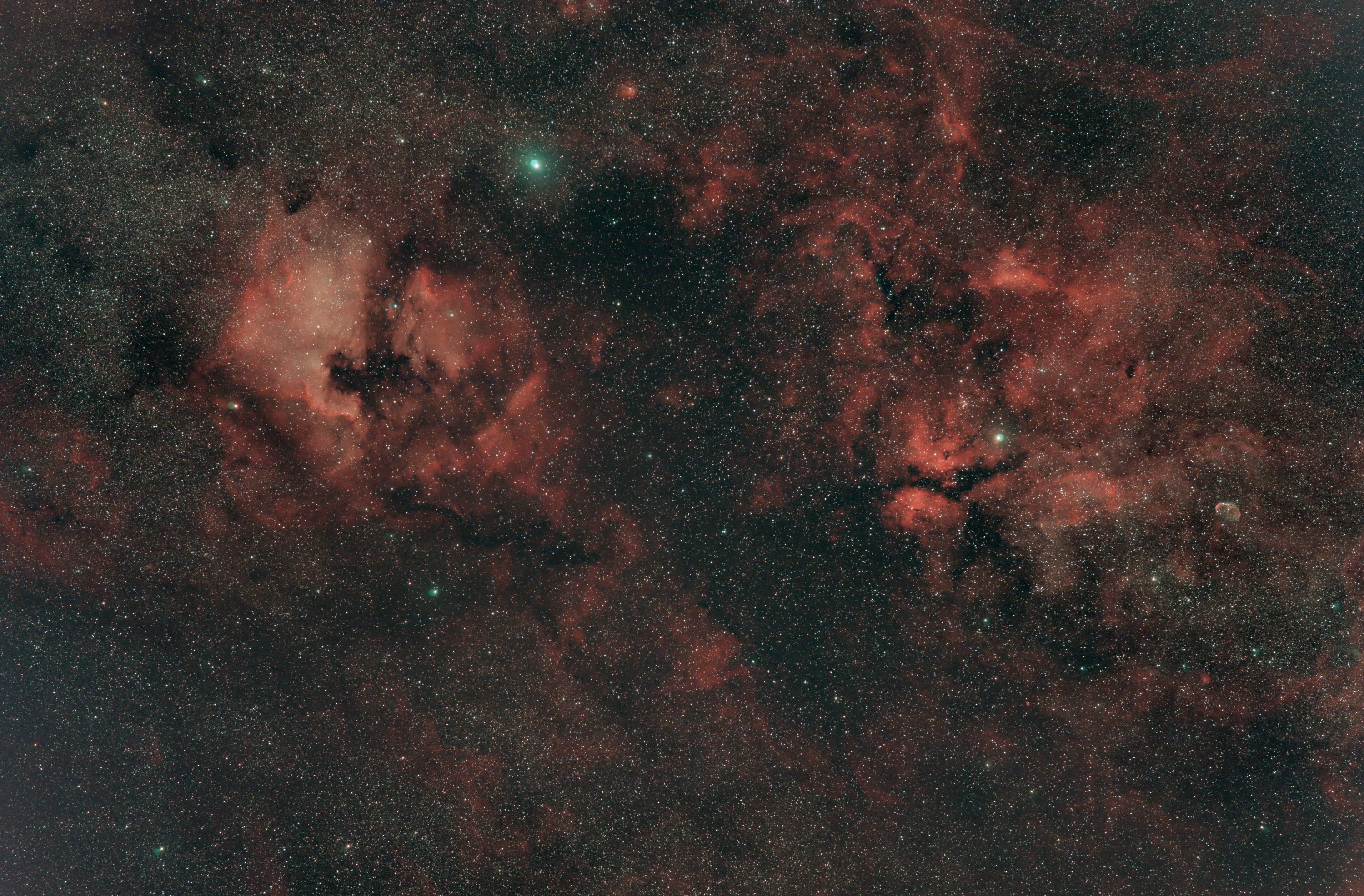 30 poses de 4 Mn avec APN Canon EOS Ra et filtre STC Duo Narrowband, Obectif SIGMA 85mm ouvert à 4 à ISO 5000, cadrage ajusté pour avoir NGC 7000 et Dentelles