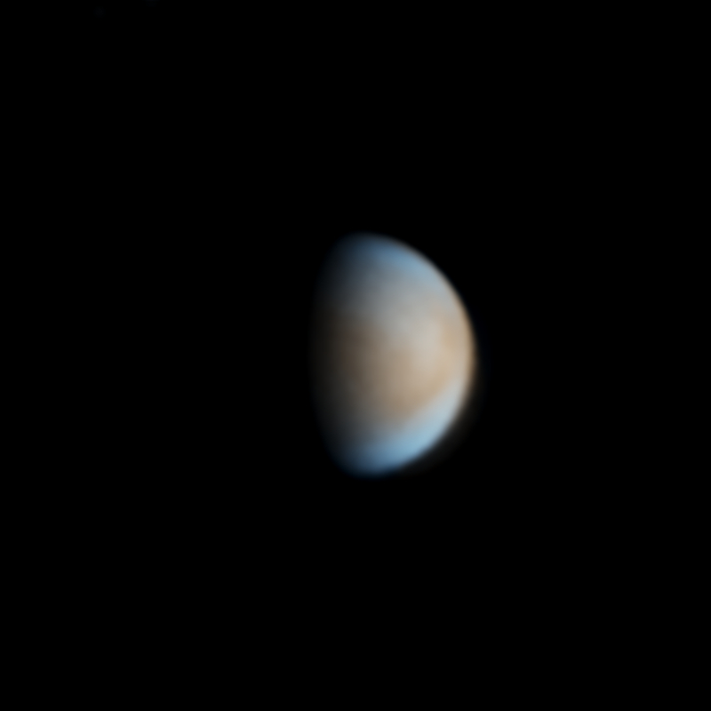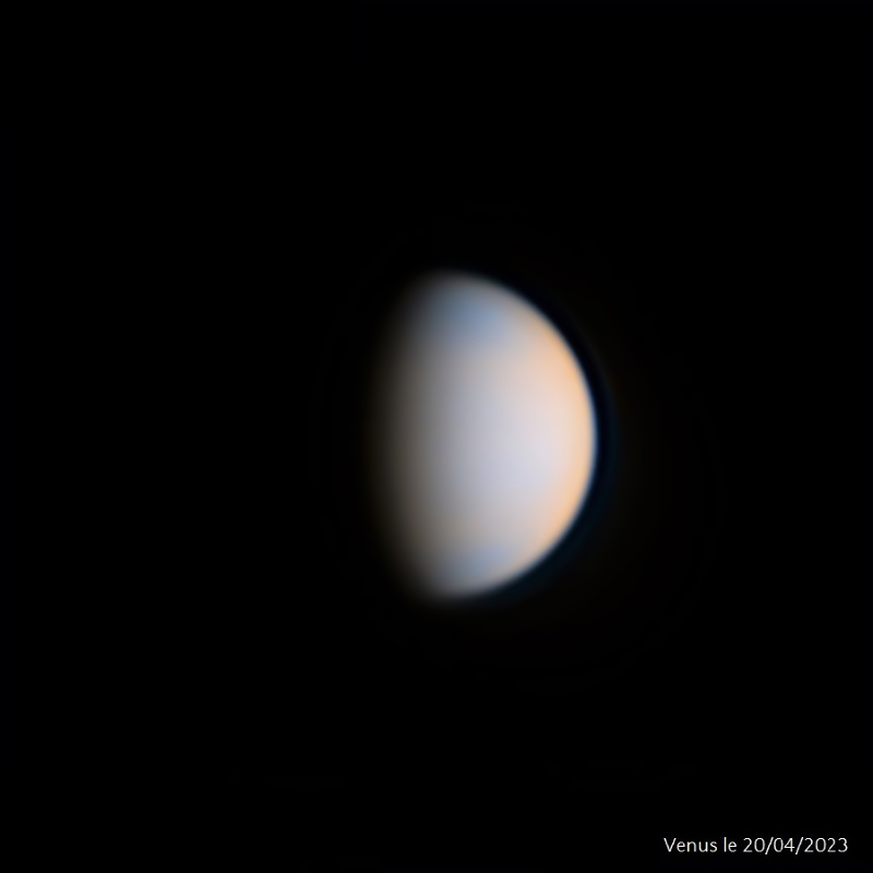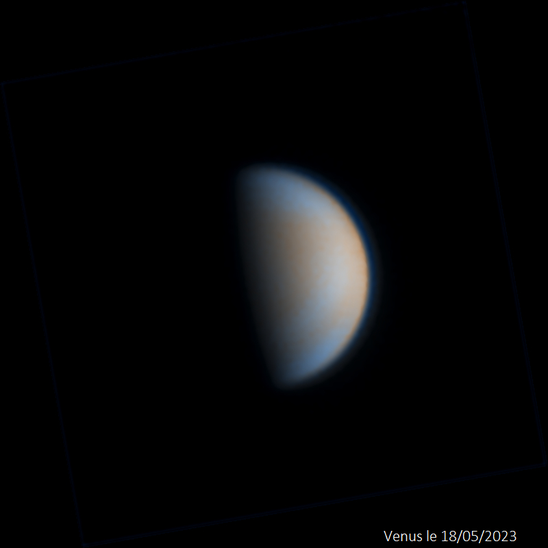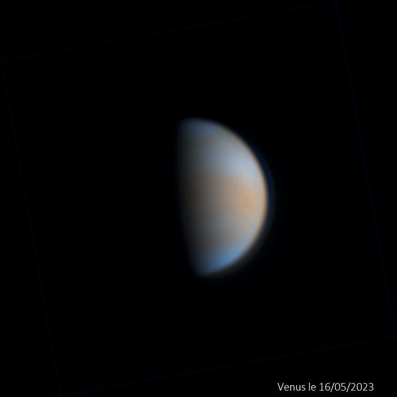 Voici une série d'images de Venus prises d'avril à Mai 2023 ..Les images sont réalisées avec deux filtres : Un filtre IR-742 pour la couleur rouge et un filtre UvVenus pour la couleur bleue . La couleur verte est créée en combinant les deux filtres de cette façon : IR*0.5 + Uv*0.5