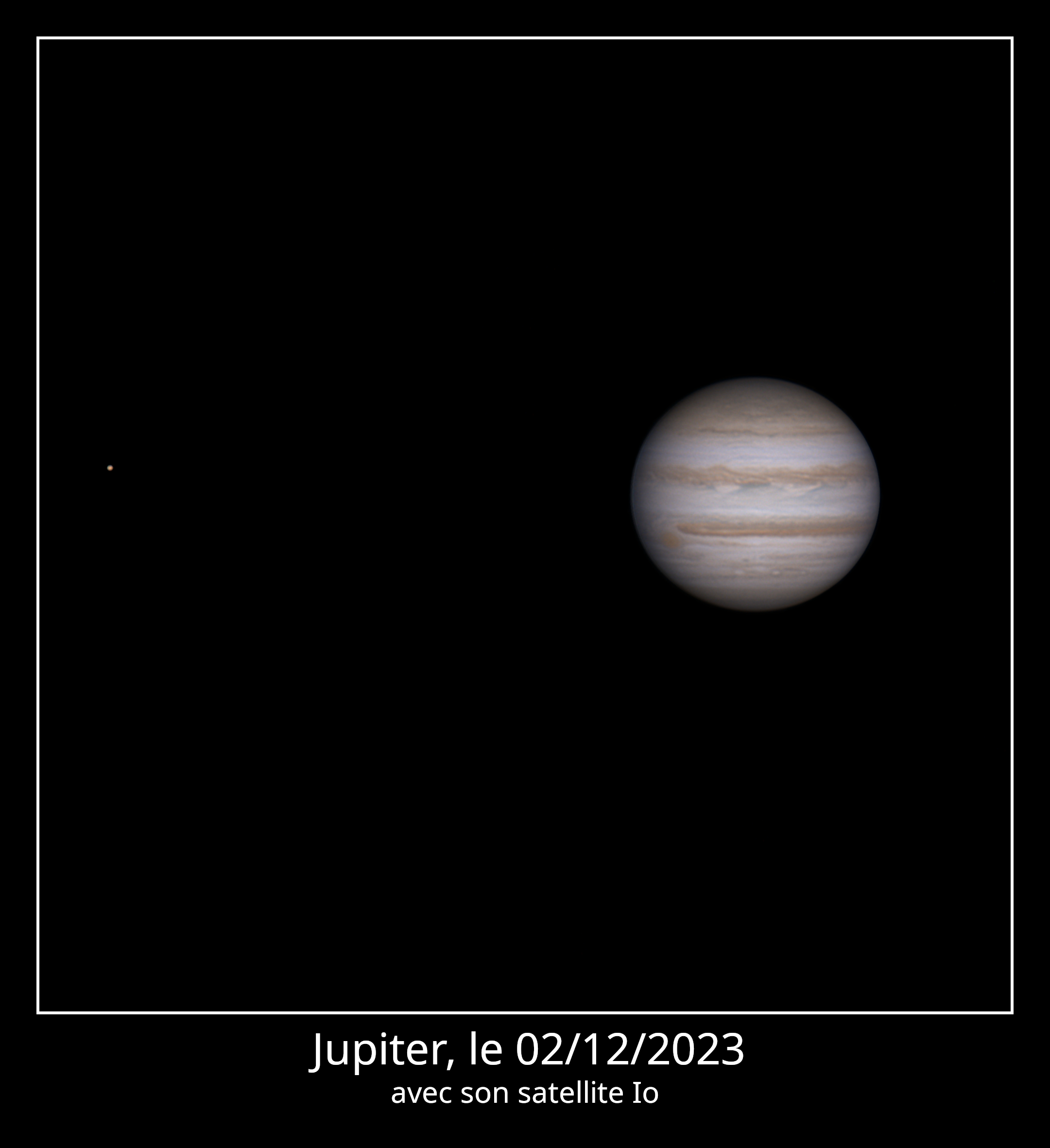 Le ciel du 02/12/2023 semblait favorable, et j'ai donc lancé une session d'environ 4h30 sur Jupiter. Au total environ 70 films de 140s chacun, dont j'ai conservé entre 40 et 80% des images suivant le moment dans la soirée. Malheureusement la planète est parfois passée au dessus des cheminées des maisons du quartier, et la qualité était alors moins bonne. Au final, une photo et en cadeau bonus une animation sur la période 17h36 à 22h04 (je n'ai pas eu la possibilité de continuer, dommage!). Pour la photo, Io est ajoutée à l'aide d'un traitement à part. Je n'ai pas eu le courage d'intégrer le satellite dans l'animation... et je la reprendrai quand j'aurai la motivation car elle est perfectible au niveau des artefacts et des couleurs.