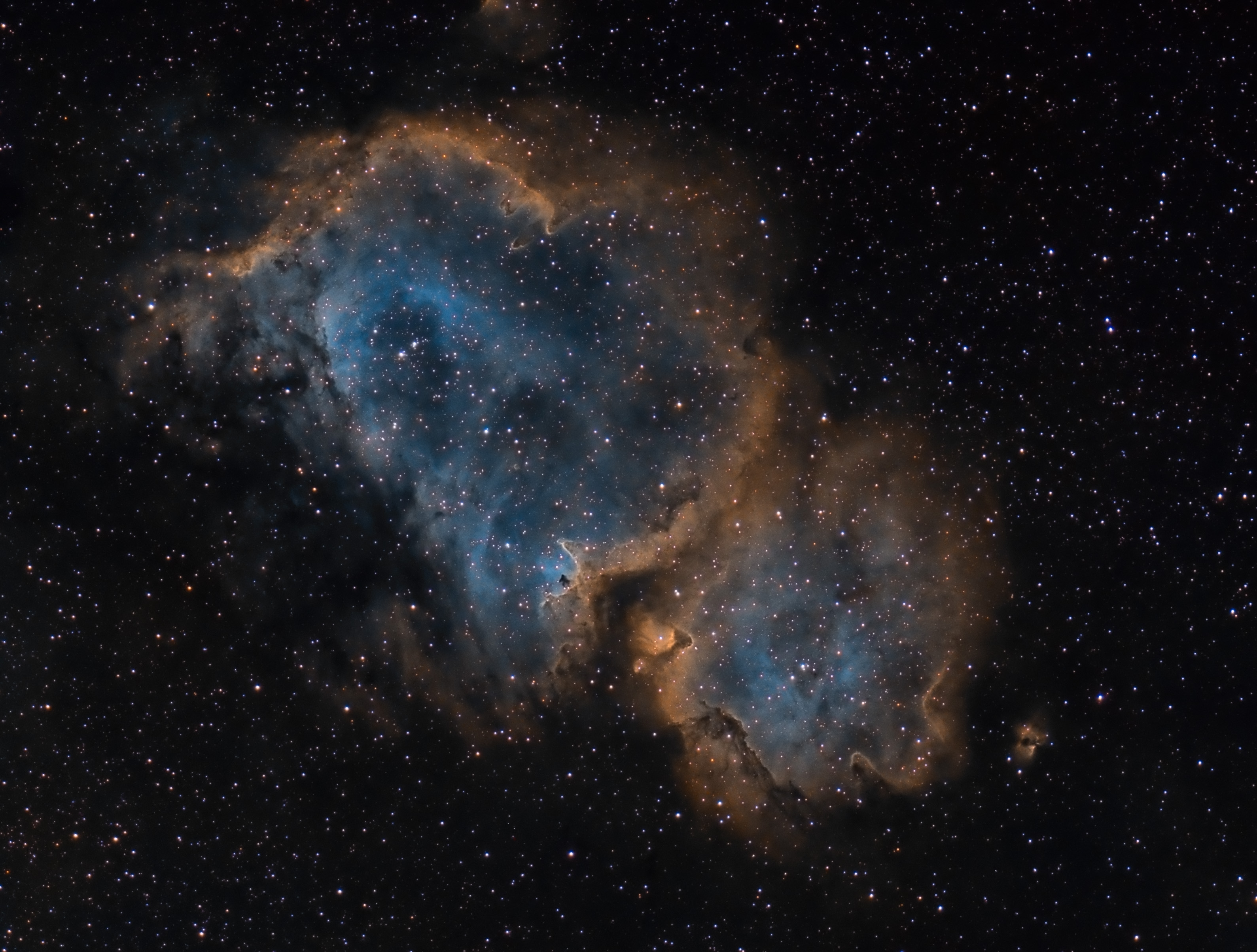 Cette images est réalisée avec notre nouvelle lunette TS triplet FPL-53 80/480, réducteur/correcteur photoline TS x0.79, Camera QSI683wsg-8, filtres SHO astrodons 3nm, autoguidage avec Lodestar le tout étant entrainé par une EQ6.