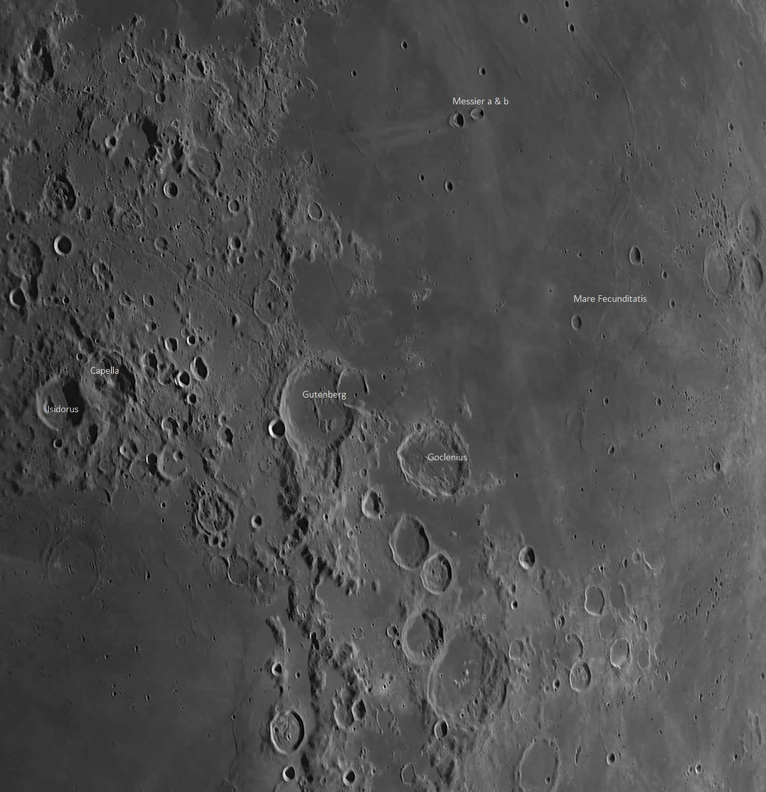 Voici une première série de 10 images de la Lune du 25 Mai 2023 . J'ai doublé toutes les images en faisant une copie annotée avec les principaux cratères, mers ou montagnes représentés sur celles-ci. Le nom des images sont explicites de l'emplacement et de la date à laquelle elles ont été réalisées.
