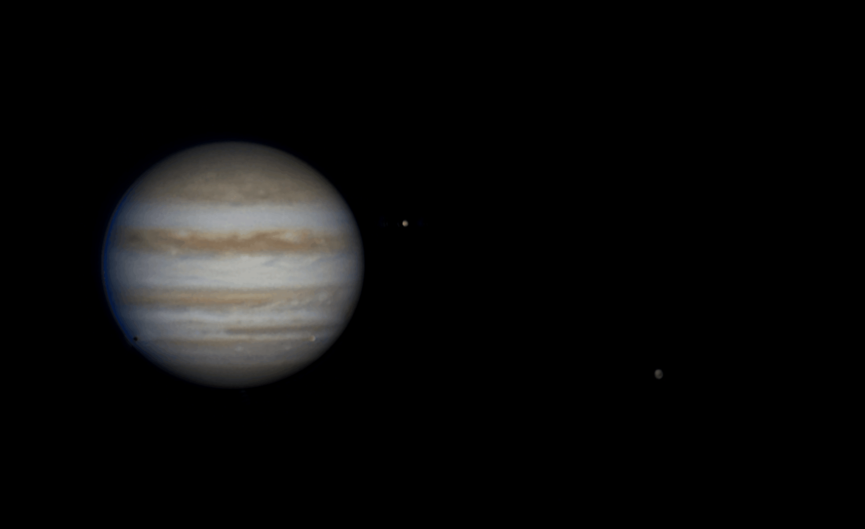 L' animation n'est pas aussi fluide que je l'aurai voulu, mais c'est la difficulté très élevée de réaliser l'alignement des 3 satellites et de l'ombre dans winjupos pour la création d'images intermédiaires qui me l'a finalement imposée. Winjupos est un logiciel extraordinaire, mais je pense en avoir tiré le maximum que je pouvais. Pour finir l'intervalle entre chaque image est en moyenne de 90s , et avec ces difficultés, je n'ai pas pu le diminuer ... D'où l'effet un peu saccadé de l'image et vous m'en voyez désolé ..