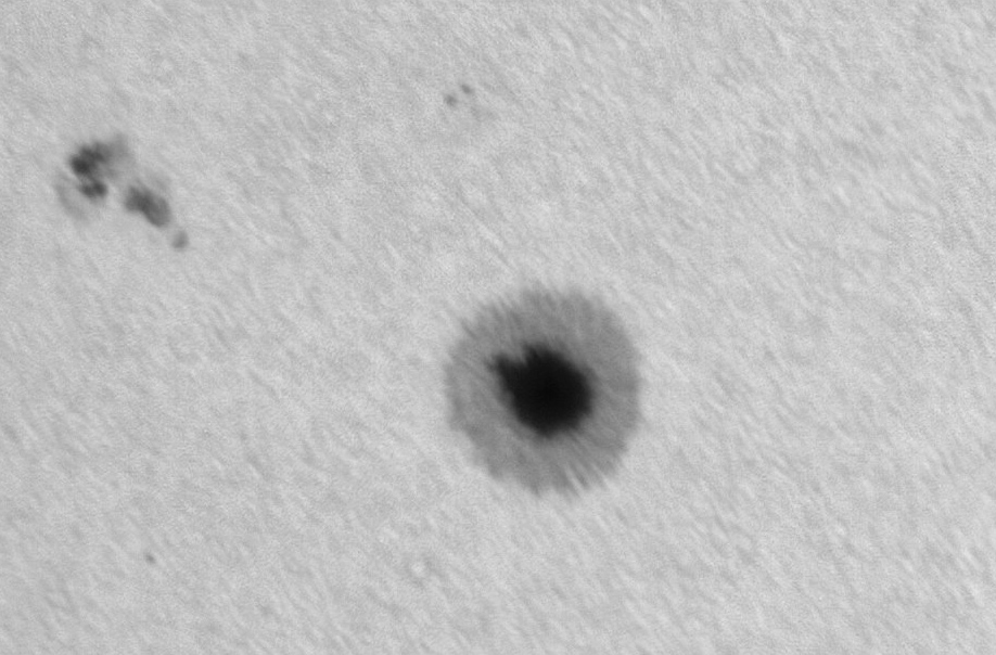 Voici une image de la tâche solaire AR4087 prise à Buthiers avec un C8 (focale = 2000mm) sur monture celestron AVX et une caméra Player one Sedna M. Filtre astrosolar ND5. Pas de filtre sur la caméra et mise en station approximative donc pas possible de faire un sync sur le soleil. J'ai même oublié de modifier le suivi sidéral en suivi solaire. Dans astronome amateur, c'est l'adjectif l'important !