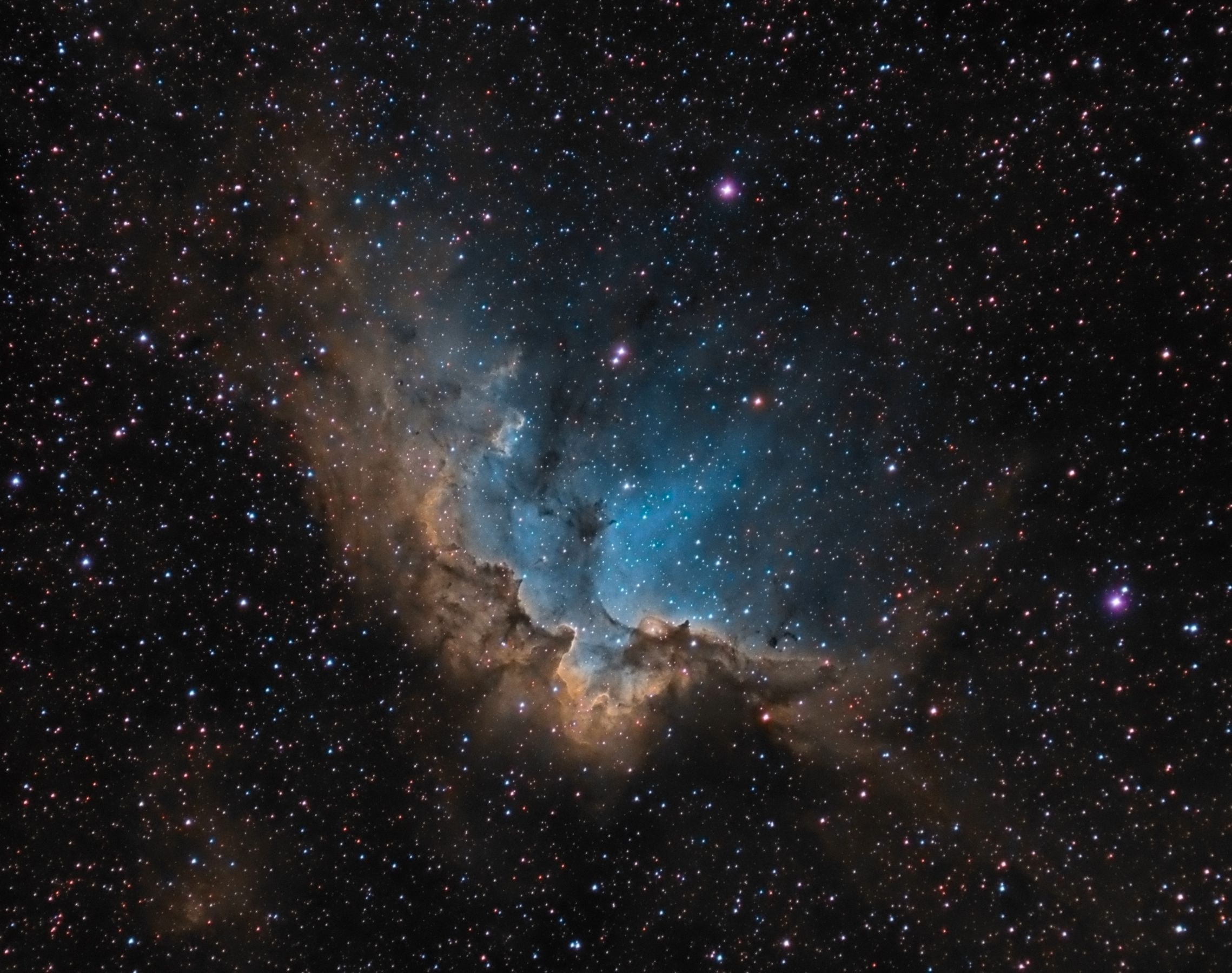 une lunette 80ed sur monture EQ6, camera : QSI683wsg-8 et Atik 460Ex (du club), filtres astrodons SHO. Guidage avec Lodestar dans PHD.