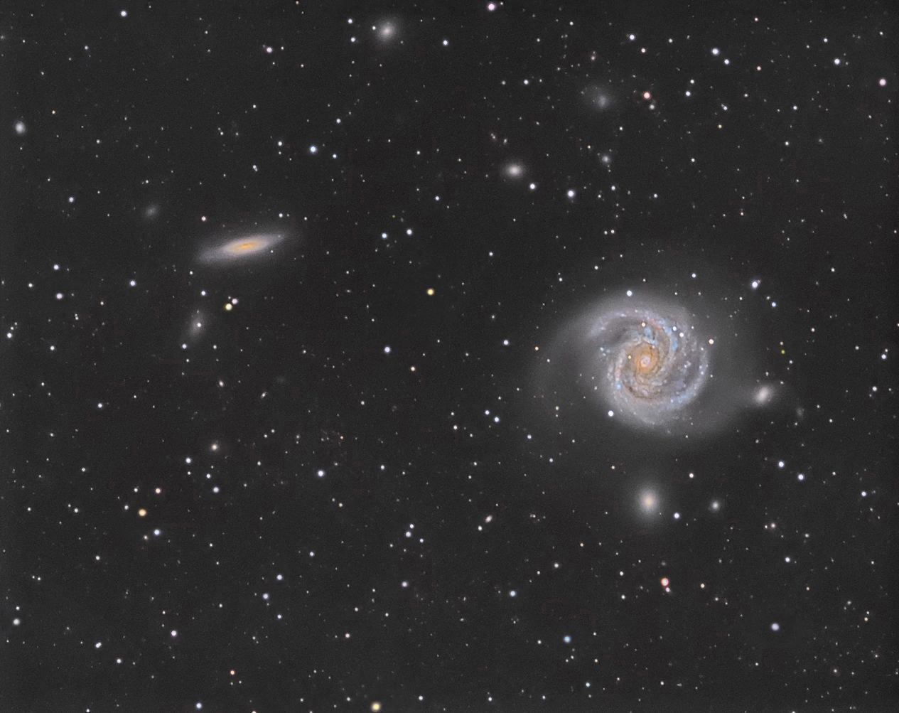 Grâce à la découverte en 1993 de 20 céphéides par le télescope spatial Hubble, la distance de la galaxie a pu être estimée à une cinquantaine de millions d'années-lumière. C'est d'ailleurs M100 qui servit de test au télescope spatial et qui en montra les défauts optiques au début de la mission. La galaxie est située dans l'amas de la Vierge dont elle est l'une des principales composantes avec M87. Ses bras spiraux les plus brillants sont peuplés d'étoiles bleues issues de l'interaction de la galaxie avec des galaxies voisines. Le diamètre de la galaxie est plus élevé que celui de la Voie lactée puisqu'il est d'environ 120 000 années-lumière. (Wikipédia)