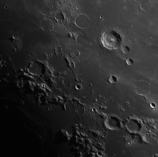 Cratère imagé avec un Newton 150/750 et une barlow *2.5 et un filtre rouge. La caméra est une ZWO120MM.