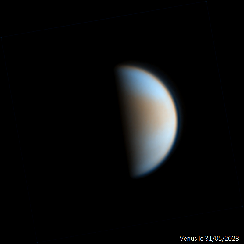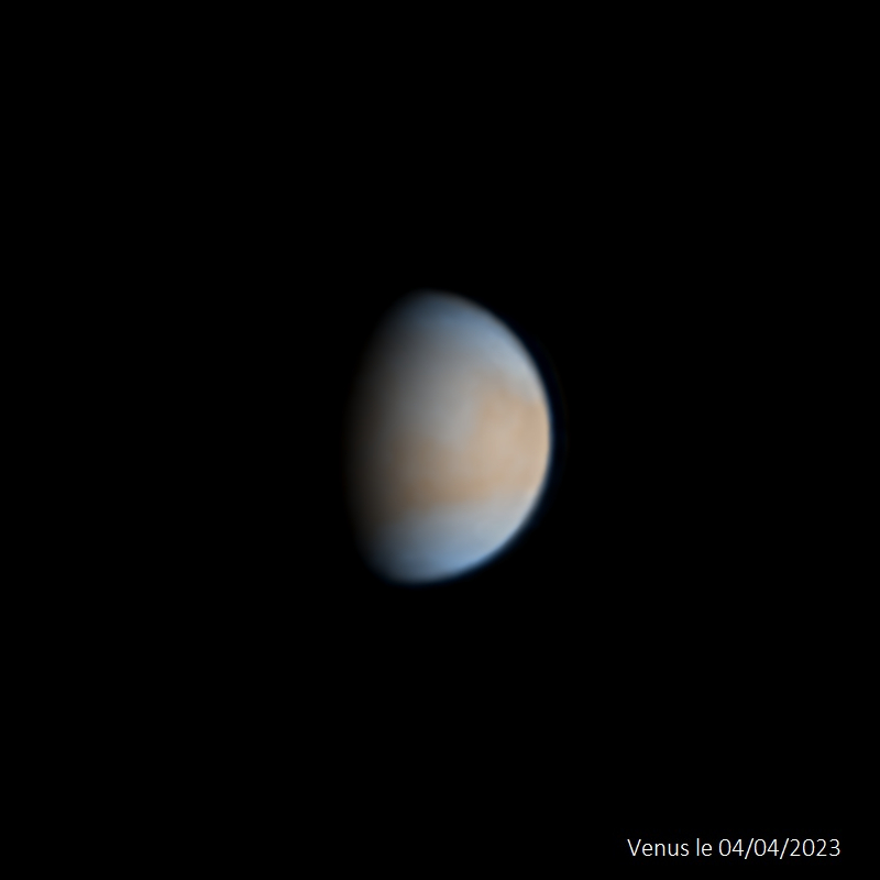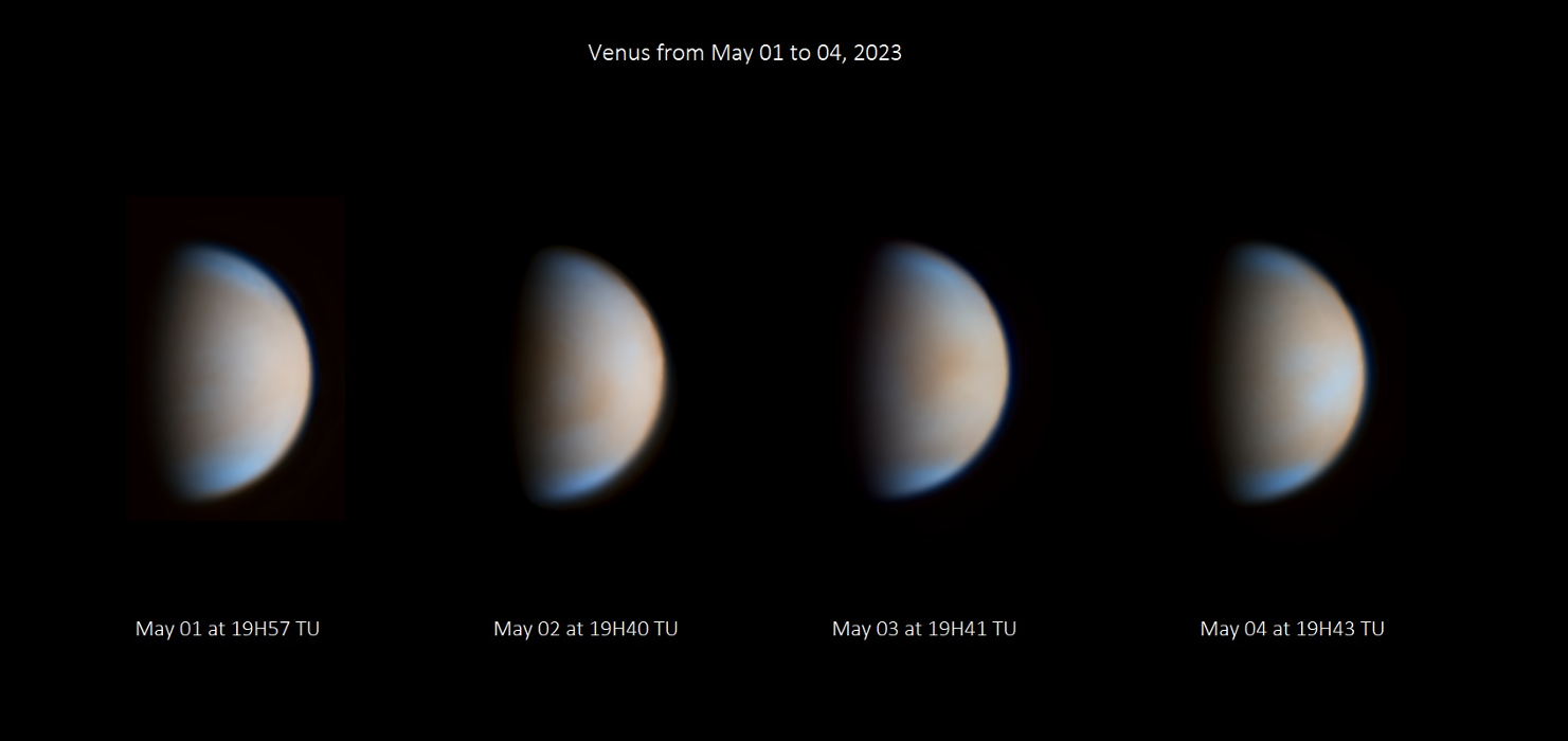 Voici une série d'images de Venus prises d'avril à Mai 2023 ..Les images sont réalisées avec deux filtres : Un filtre IR-742 pour la couleur rouge et un filtre UvVenus pour la couleur bleue . La couleur verte est créée en combinant les deux filtres de cette façon : IR*0.5 + Uv*0.5