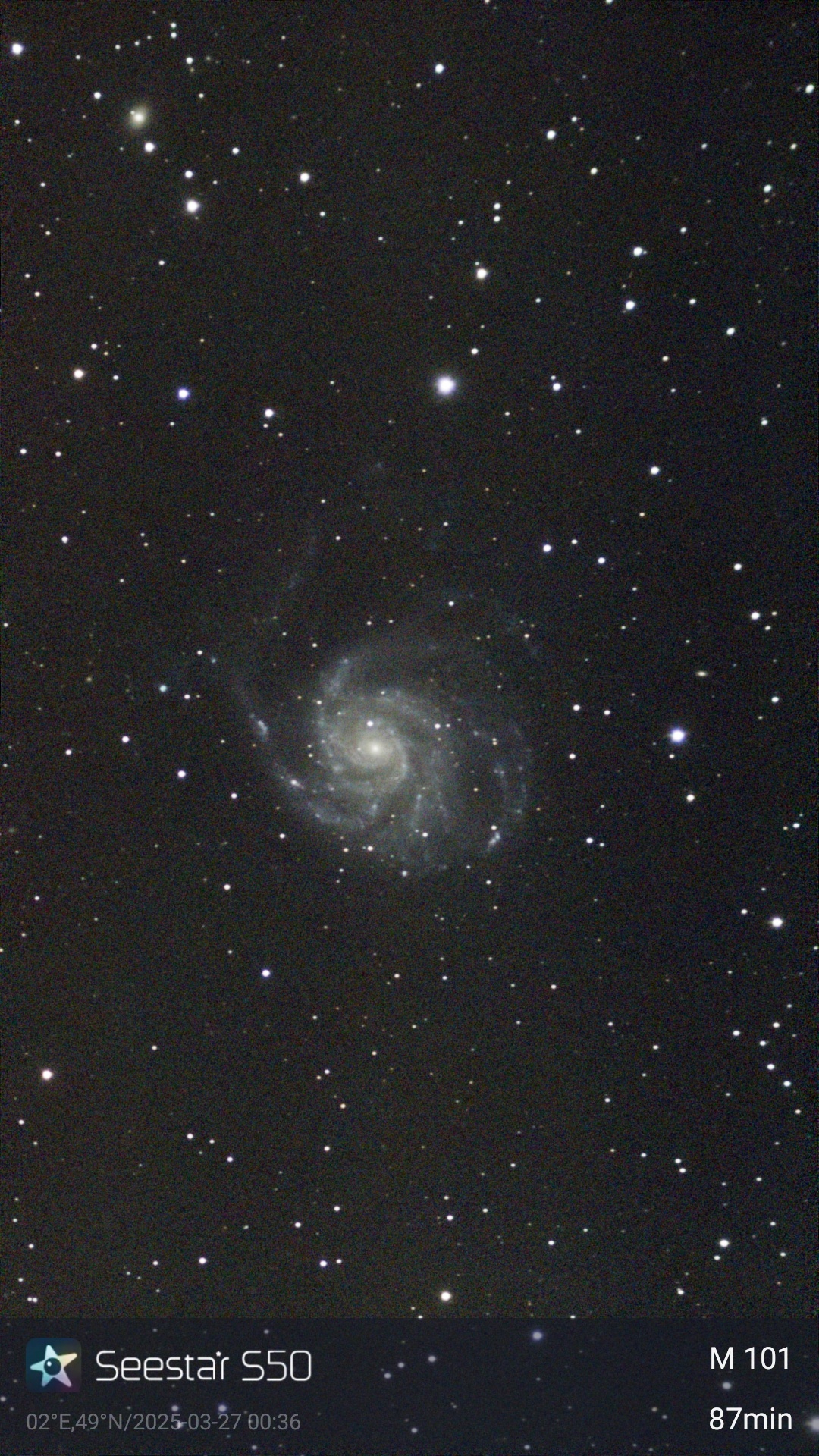 - ci-joint exemple de résultat sur M101 dans la photo jointe (1h27 d'intégration, et utilisation de la fonction "AI denoise"). Je trouve que c'est correct, compte tenu de l'optique modeste du Seestar (diamètre 50mm) et de mon emplacement en milieu urbain