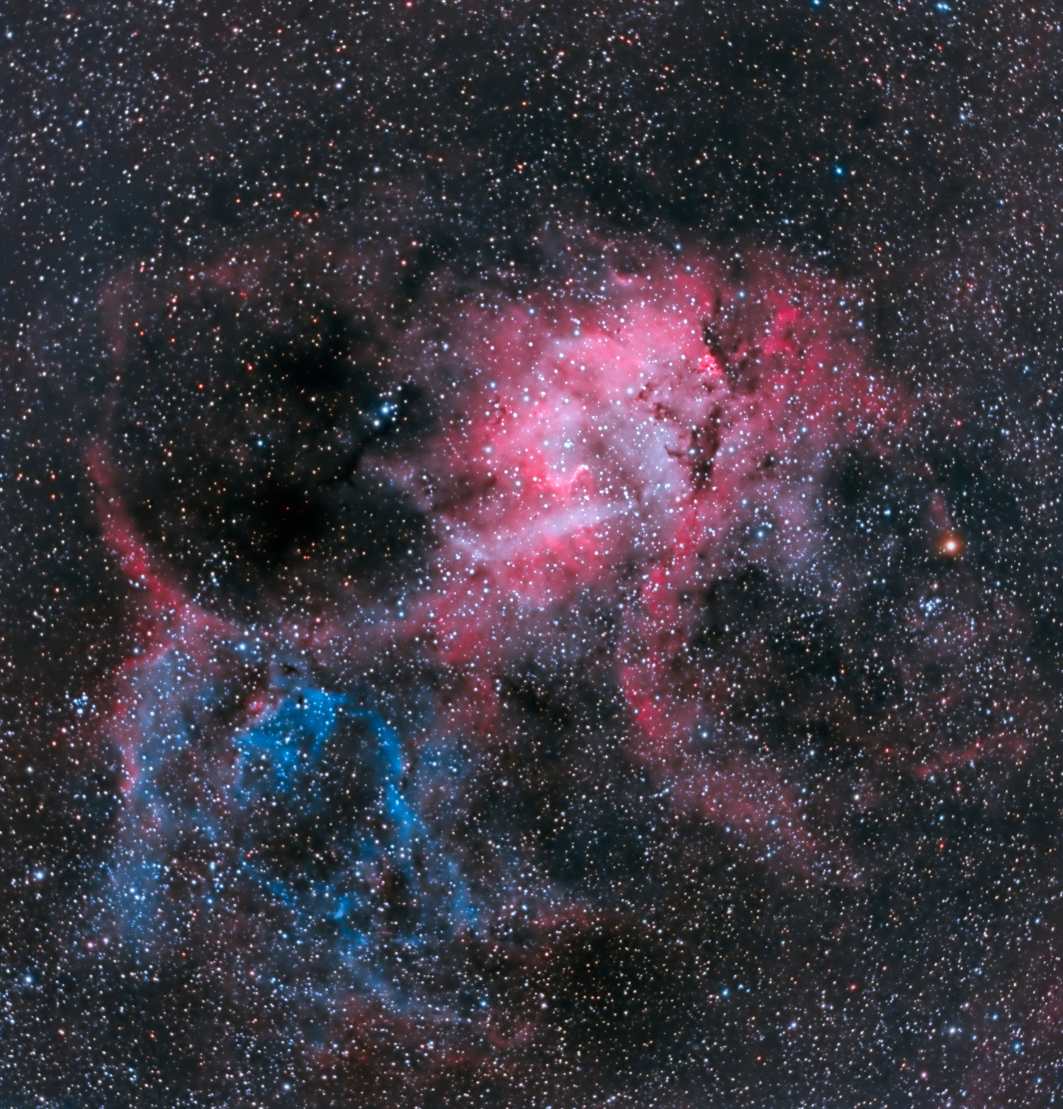 J'ai évidement pas mal galéré pour les prises de vues dans la région parisienne vu que la partie OIII de la nébuleuse est très faible et j'ai par conséquent multiplié par 2 le nombre de poses par rapport au Halpha.... Le SII n'est pas très présent non plus , mais moins difficile à saisir...