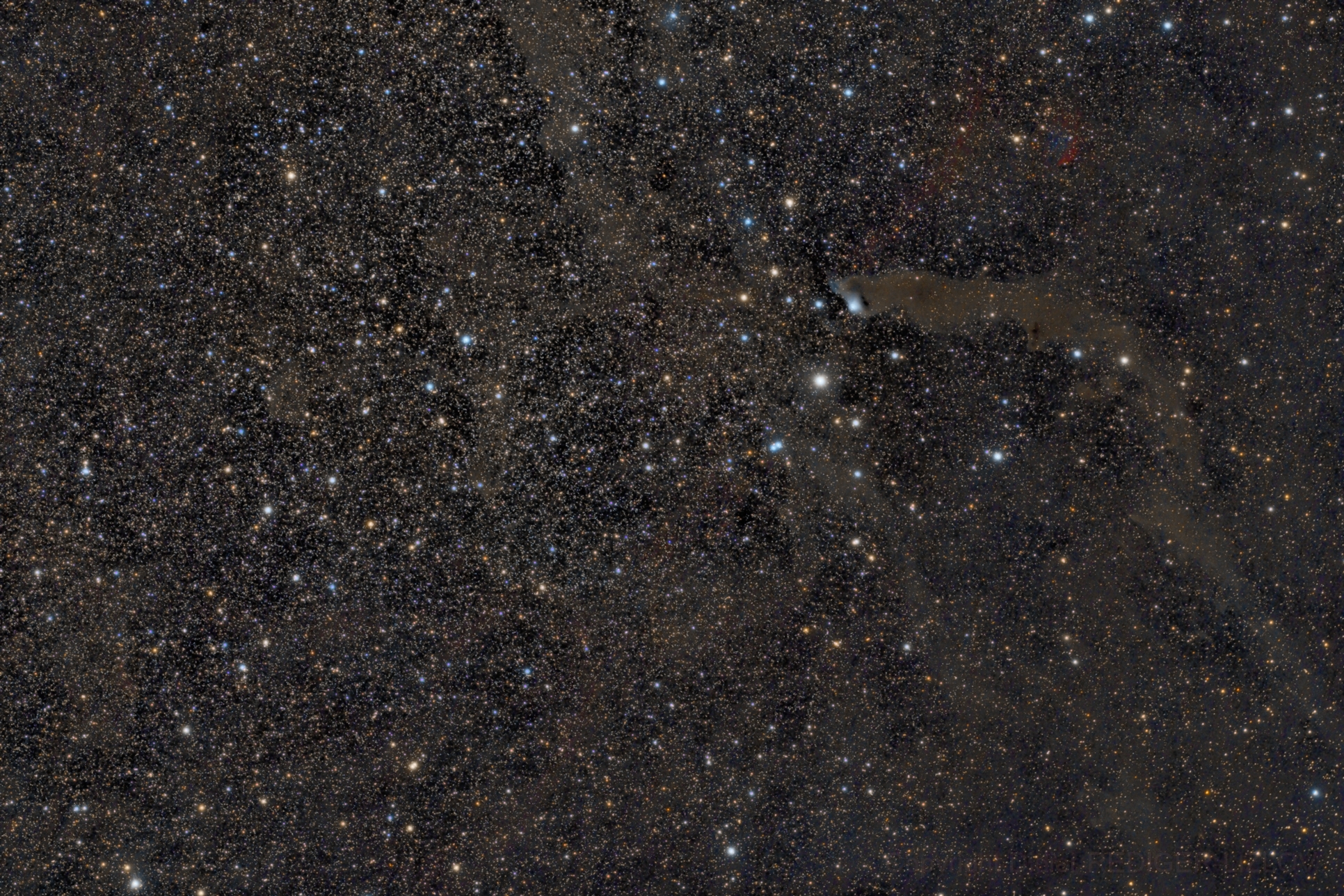 VdB 152 à la fin du nuage de poussières Barnard 175. On peut deviner en haut à droite la nébuleuse planétaire dust cloud and we can devine at the Dengel-Hartl 5 et également le fin et ténu rémanent rouge de la supernovae SNR110.3+11.3.