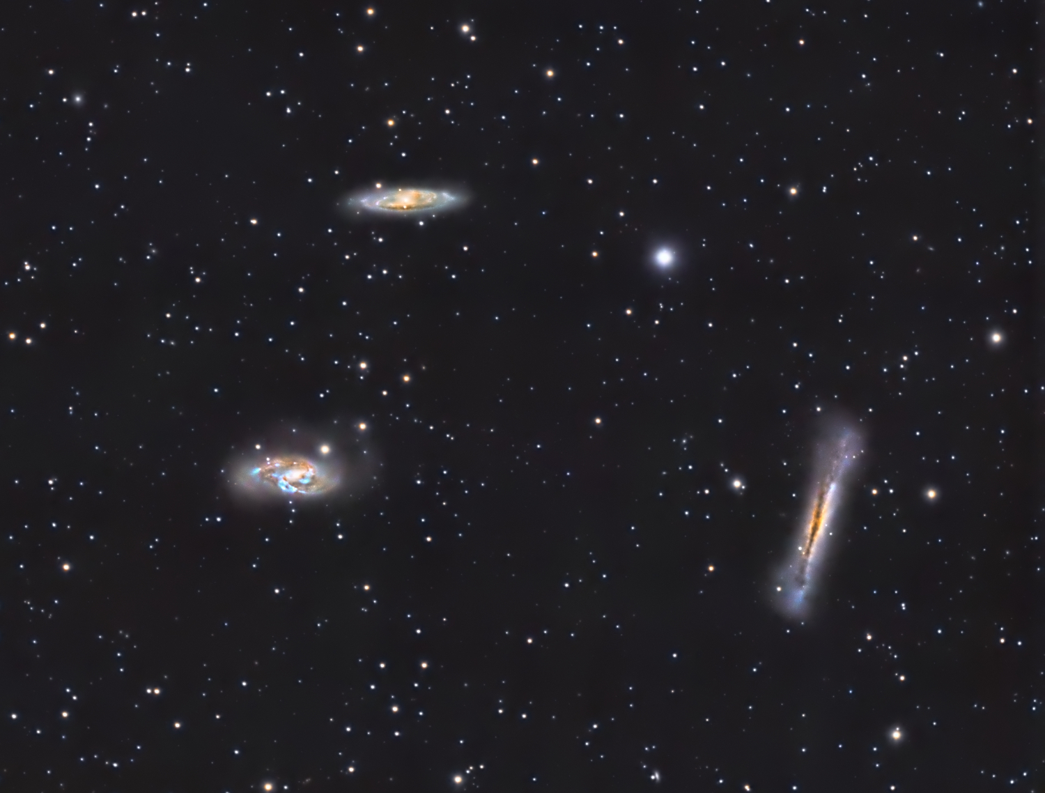 Je vous poste le trio du lion .... Mon seul regret est que je n'ai pas réussi à faire ressortir la queue de marée de la galaxie du hamburger , mais je pense que dans la région parisienne il faut quand pas trop en demander.... D'ailleurs le gradient lors de l'empilement des images était très important , ce qui explique cela je pense !!!!