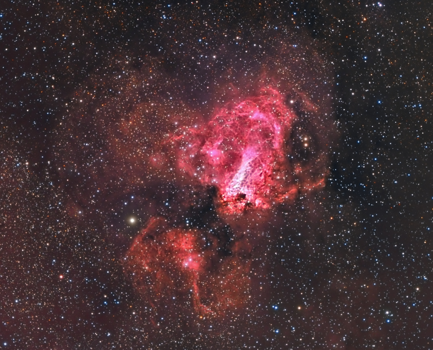 Voici donc voici Messier 17 dans le sagittaire , je l'avais essayé l'année dernière , mais faute de temps de pose, celle-ci était pas très dynamique. J'ai du faire des temps de pose max de 300s car cette nébuleuse est très basse sur l'horizon et la monture supporte mal d'avoir les contrepoids au dessus de la lunette ...........:-)