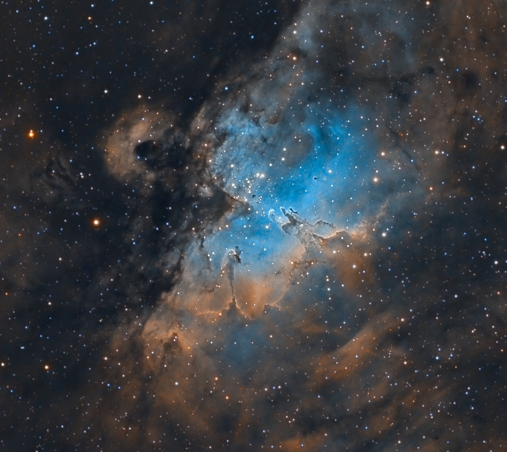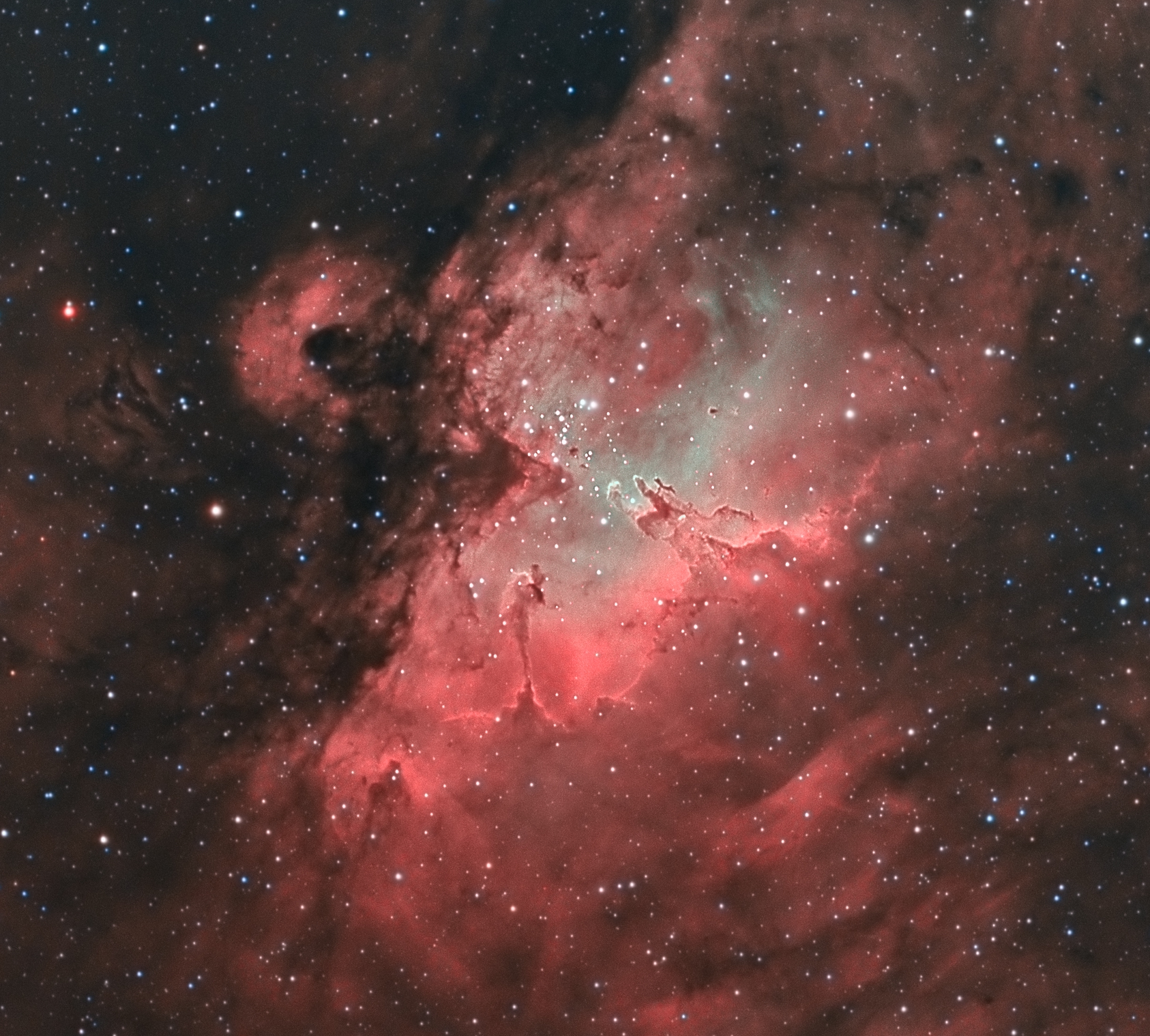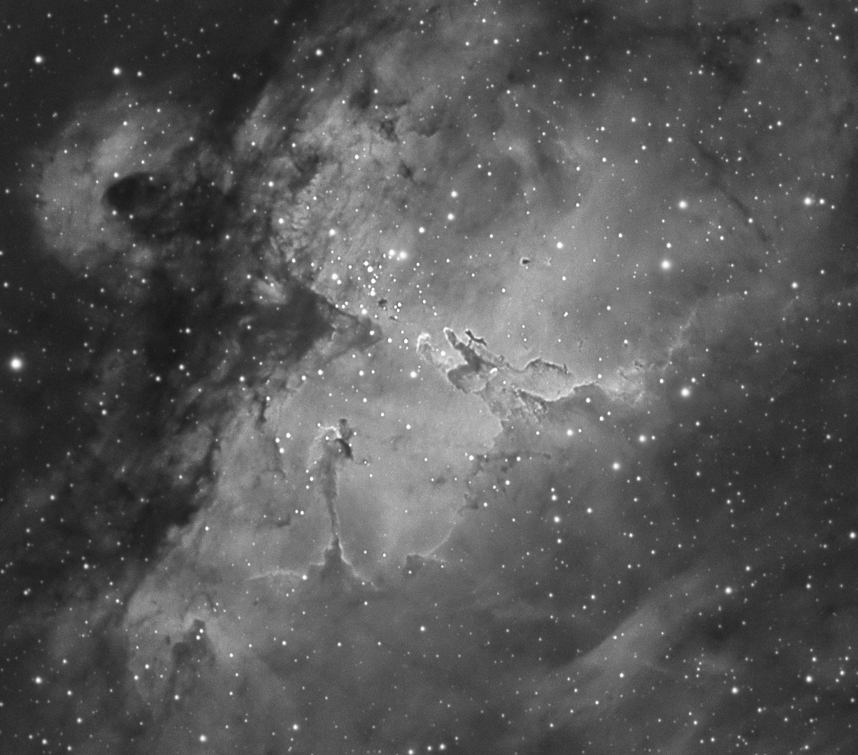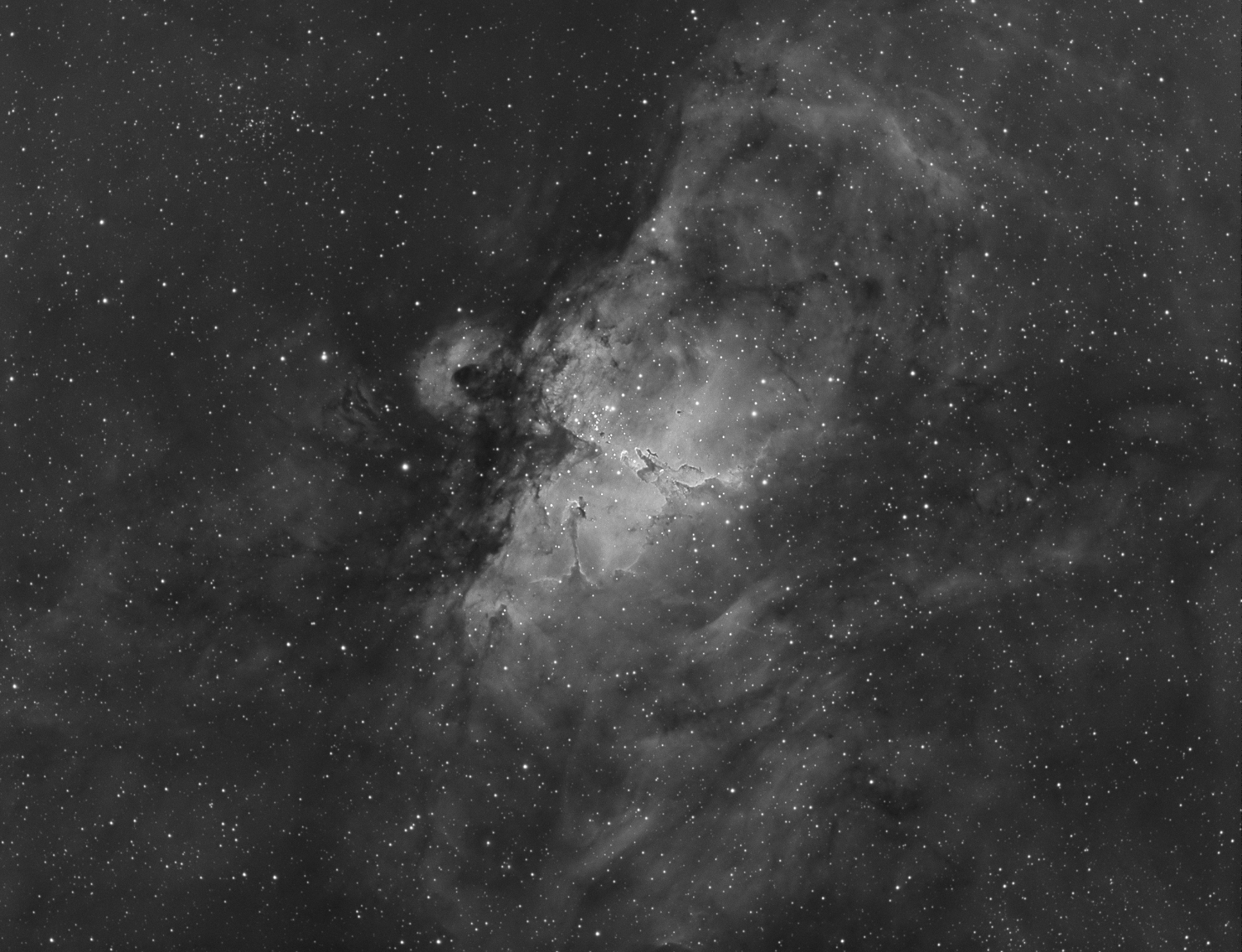 Il s'agit de Messier 16 appelée la nébuleuse de l'aigle dans la constellation d'Ophiucus avec en son sein les fameux piliers de la création. Je vous poste la version Ha en Noir & Blanc, la HOO & la SHO .......... Et en prime un petit crop raisonnable de la région des piliers.