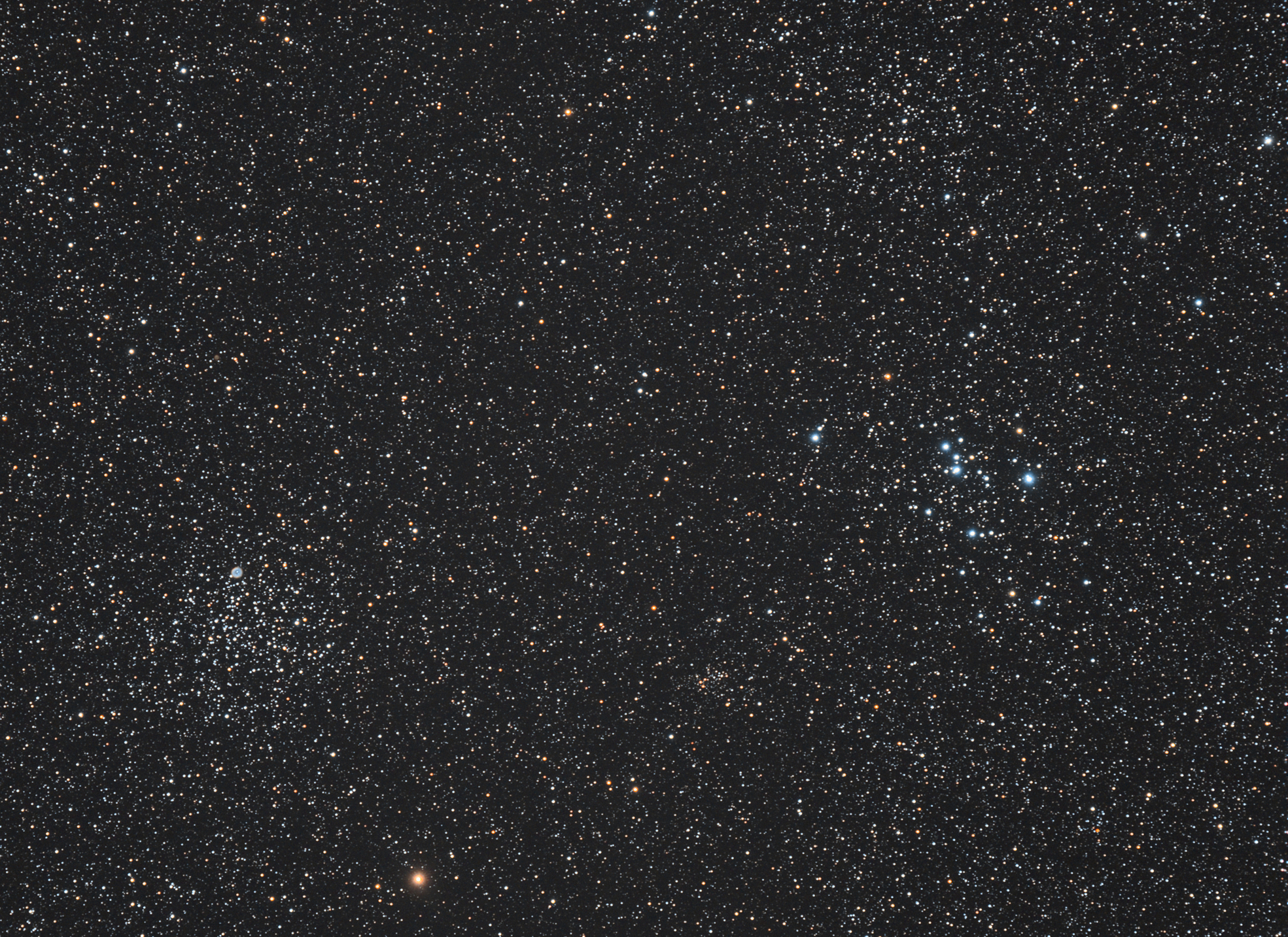 Le duo d'amas ouverts M46 et M47, et la nébuleuse planétaire NGC2438 au bord de M46, qui se superpose mais ne fait pas partie de l'amas.
